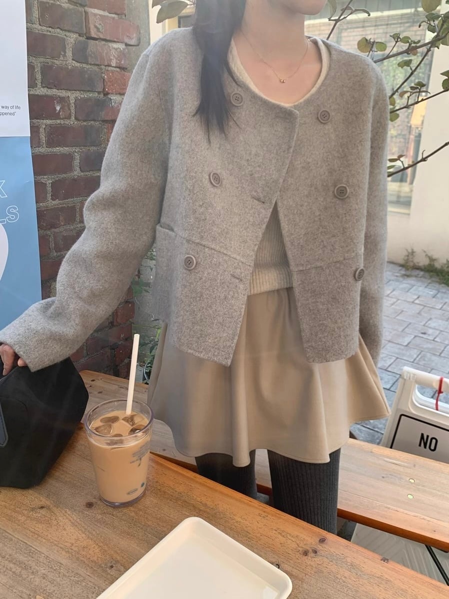 顔周りがすっきり見えるノーカラーデザインと、クラシカルなムードを高めるダブルボタンが特徴。